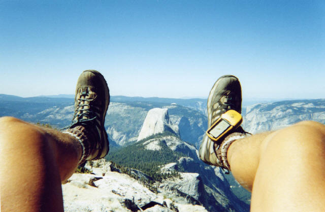 This cache, on top of Cloud's Rest in Yosemite, was my favorite cache to find. That's Half Dome between my boots.