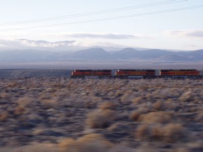 This train is traveling at high speed. Note the blurred tumbleweeds in the foreground.